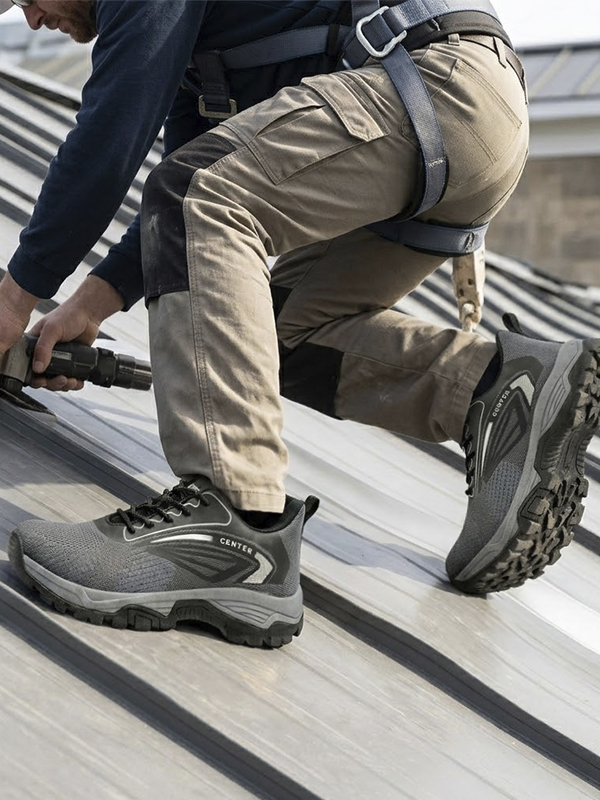 Кровельщики. На крышах наклонные скользкие поверхности (металл, битум, профнастил), горячее покрытие (+70…+100 °C летом), проливы мастики и масла. Сетка — вентиляция в жару, композит - лёгкость при долгой ходьбе по крыше, ПУ/нитрил — не скользит даже на мокром/горячем битуме + защищает от ожогов подошвы (HRO).